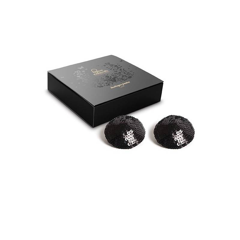 Cache tétons de Bijoux Indiscrets adhésifs et réutilisables. (il vous suffira de nettoyer la partie adhésive avec un savon au ph neutre et de laisser sécher) Ils sont couverts de plusieurs petits disques en plastique noir.