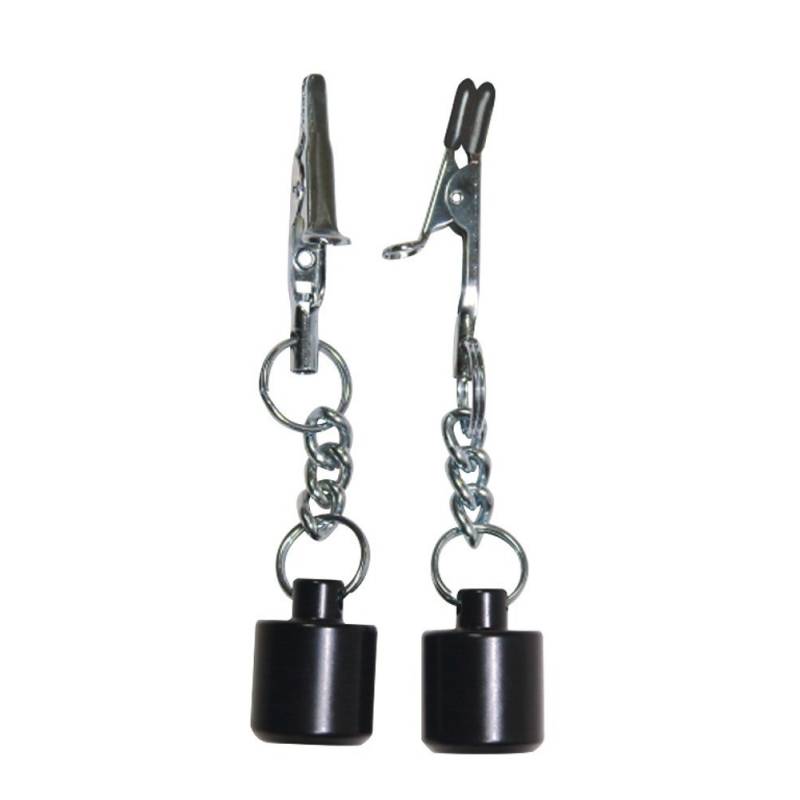 Les pinces sont équipées de protections noires en plastique, ellessont reliées à une petite chaîne en acier, fixée à 1 poids de 50grammes noir en acier de forme cylindrique.