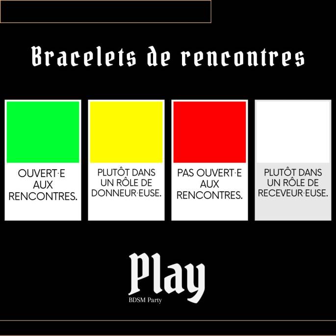 Système de bracelets - Respect et Consentement : Lors de la soirée PLAY 5, nous mettons en place un système de bracelets pour garantir une communication claire et respectueuse entre les participants. Ce système permet de signaler vos envies et vos limites de manière simple et visible :