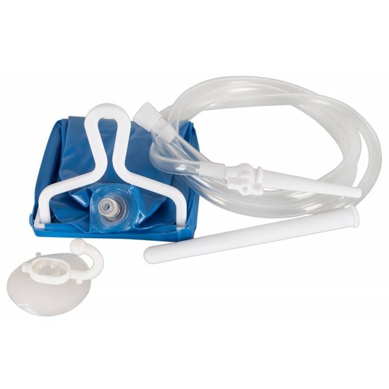 Réservoir a lavement, pliable, avec crochet ventouse et deuxembouts interchangeables.
