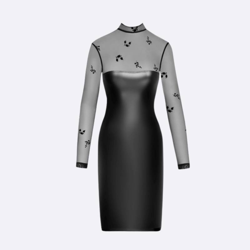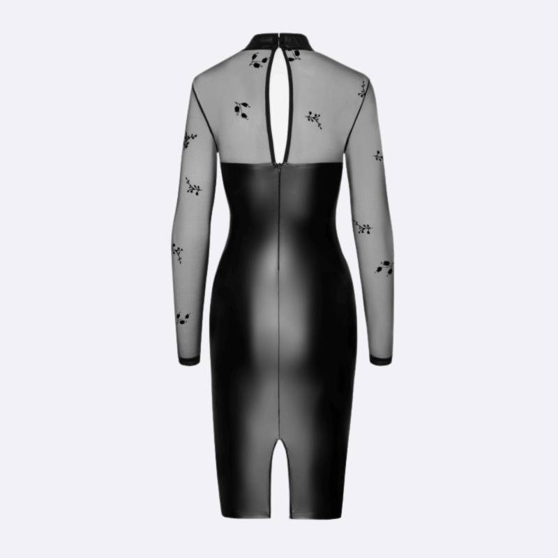 Autorisez-vous l'audace avec notre robe crayon en wetlook extensible. Sa coupe moulante et son haut transparent à motifs floraux créent une allure sensuelle et sophistiquée. L'ouverture goutte au dos et la fermeture par agrafes à la nuque ajoutent une touche d'élégance. Parfaite pour les occasions spéciales, cette robe vous fera briller avec style.