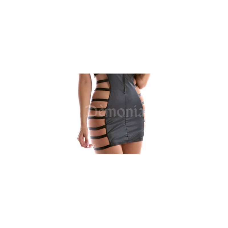 Robe courte avec empiècements en wetlook devant et au dos, ouverte de chaque coté avec toute une série de bandes pour un effet ultra sexy et graphique qui accompagne et sublime vos courbes
