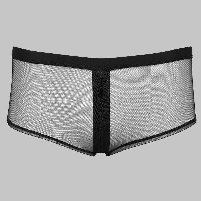 Un shorty ultra-transparent, à la coupe taille basse, orné d’un zip suggestif à l’entrejambe. Une lingerie fluide et directe, pour celles et ceux qui aiment jouer avec les codes.