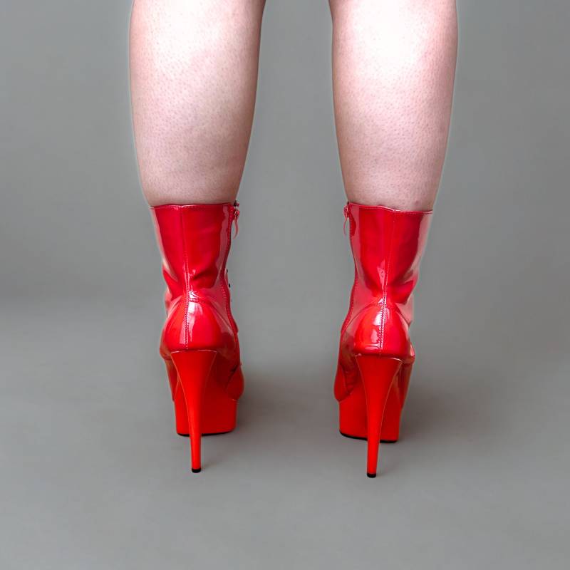 Imaginez-vous dans le hall d'un vernissage d'art avant-gardiste ou à l'entrée d'un concert privé. Le bruit sec de vos talons sur le marbre annonce votre arrivée. Vous sentez le maintien impeccable de la tige haute qui enlace votre cheville, un soutien sans faille pour une démarche lente et assurée. La lumière se brise sur la surface laquée de vos chaussures vinyle rouge, créant des reflets hypnotiques. Votre bottine fétichiste à lacet n'est pas seulement un accessoire, c'est une pièce maîtresse qui structure toute votre tenue. Chaque œillet, chaque passage du lacet rouge, est un détail qui ancre votre présence et captive l'attention, bien avant que les regards ne se posent sur vous.