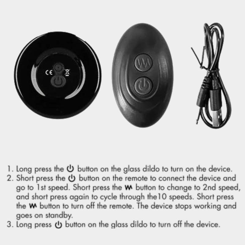 Appuyez 3 secondes sur le bouton marche/arrêt du vibromasseur ou de la télécommande pour allumer puis faites défiler les modes. Pour éteindre, maintenez à nouveau 3 secondes. Manipulez avec précaution : le verre peut devenir glissant lorsqu’il est lubrifié.