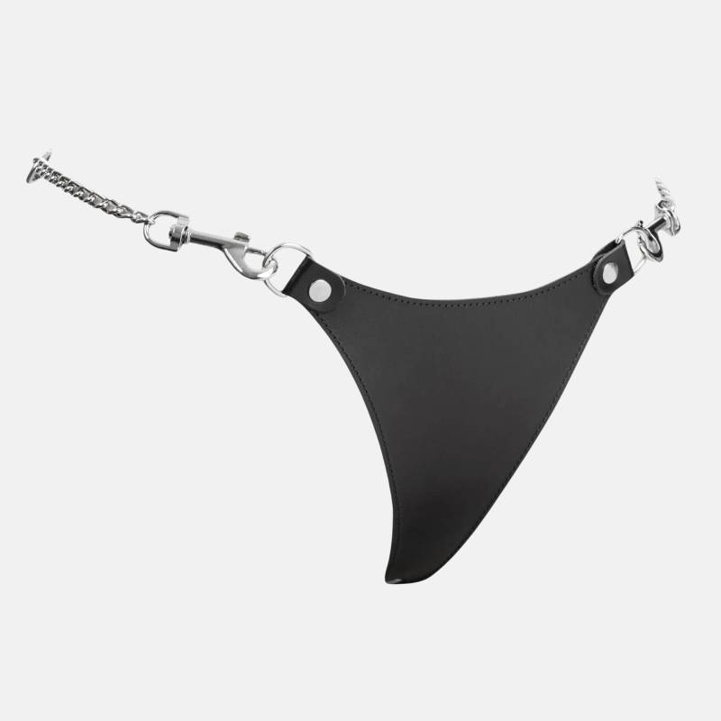 Ce string en cuir avec chaînes amovibles est une pièce emblématique de l’esthétique BDSM cuir.