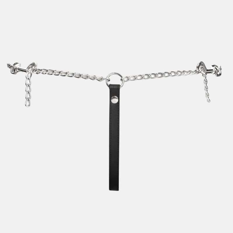 Les chaînes métalliques, fixées par mousquetons, soulignent les hanches et créent une mise en valeur très fetish, entre provocation, domination et sensualité brute.