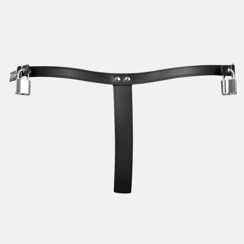 String de chasteté en cuir véritable, cadenas inclus, réglages latéraux à boucles.