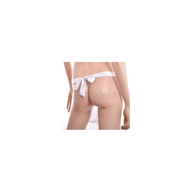 Petit tablier composé d'une partie avec de la dentelle montée sur une ceinture se nouant derrière.