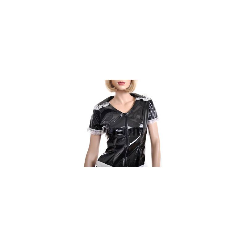 Tenue avec un zip devant et livrée avec un tablier en tissu brillant se nouant derrière.