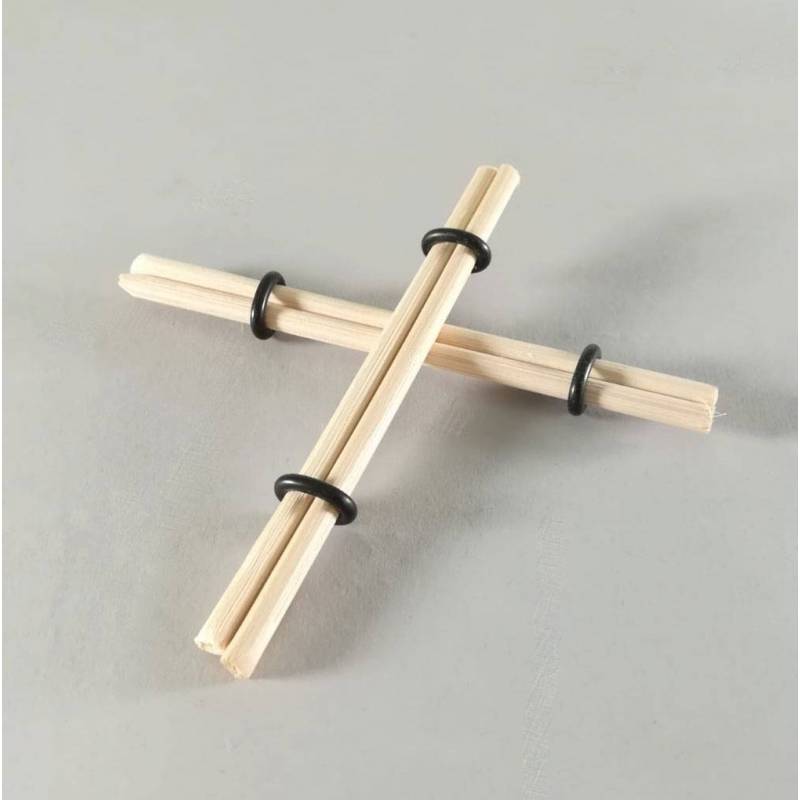 2 tiges de bois (rotin de Manille) reliées entre elles par 2 anneaux en latex noir