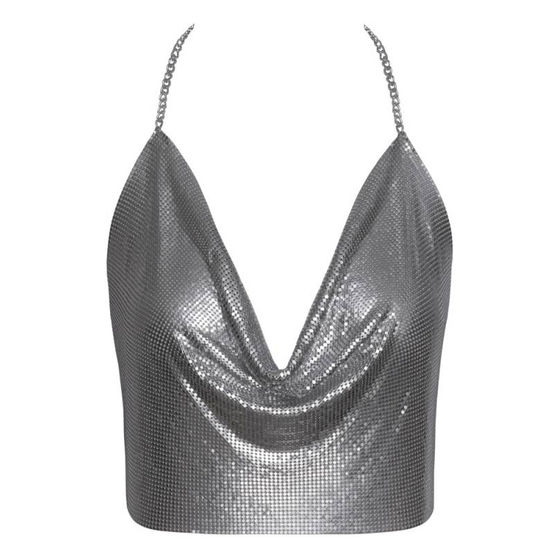 Un top dos nu étincelant en métal argenté, souple et sensuel. Une pièce bijou qui épouse le corps et attire tous les regards sous les lumières.