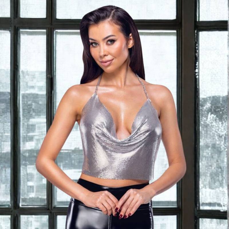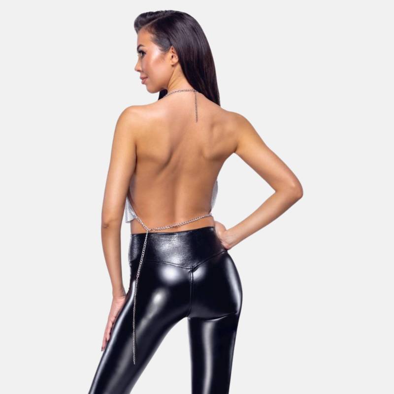 Ce top argenté dos nu est bien plus qu’un vêtement : c’est un bijou de corps. Ses plaques métalliques irisées se fondent sur la peau en un drapé liquide, évoquant la sensualité des années disco et l’audace des soirées fetish modernes. À la fois séduisant et sophistiqué, il incarne l’érotisme chic et la liberté du mouvement.