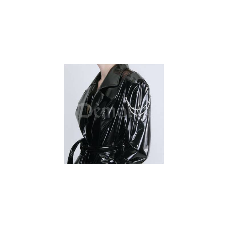 Très beau manteau avec boutons pression, ceinture en vinyle, et une petite chainette sur l'épaule.
