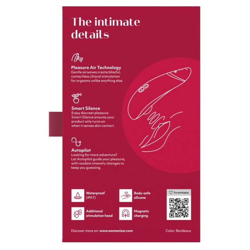 Le Womanizer Premium 2 est un stimulateur à ondes de pression puissant, mais silencieux, qui offre désormais 14 (au lieu de 12) intensités différentes, contrôlables par simple pression sur un bouton (+/-). La technologie brevetée Pleasure Air Technology stimule le clitoris au poil près, sans contact - même dans le bain ou la douche, car elle est étanche. La nouvelle fonction Autopilot améliorée change automatiquement d'intensité pour rendre le plaisir encore plus surprenant. Grâce à la fonction Smart Silence, le Womanizer Premium 2 ne s'active que lorsque le contact avec la peau est assuré. Jusque-là, le Premium 2 fonctionne en mode veille presque silencieux. En cas d'inactivité, le Premium 2 s'éteint automatiquement au bout de 5 à 10 minutes (selon l'état de la batterie). Il est facile de pallier à ce problème en appuyant par exemple sur l'un des niveaux d'intensité/pilote automatique.