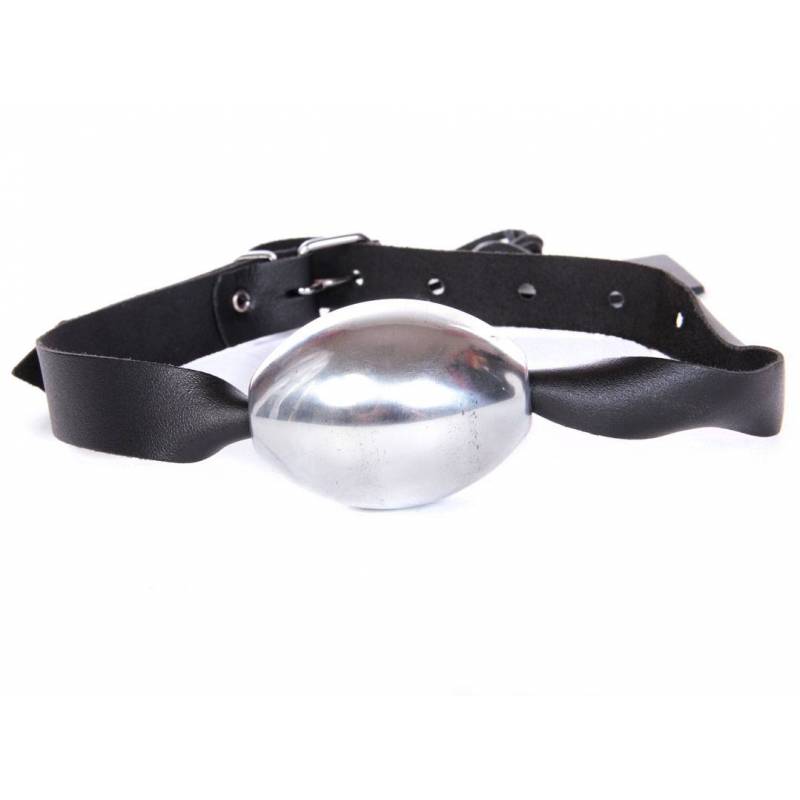 Bâillon avec lanière en cuir souple réglable (9 positions) et boule allongée en métal qui vous pouvez glisser sur ma lanière comme bon vous semble.