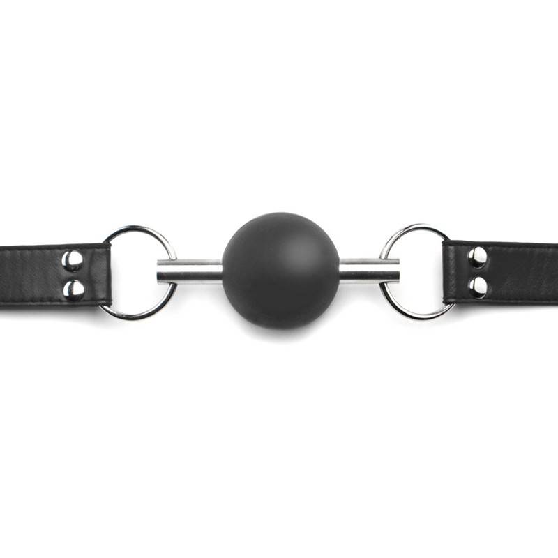 Bavaglio a sfera nero con asta in metallo, ideale per il gioco silenzioso BDSM. Palla in morbido silicone e cinghie regolabili per un controllo sicuro e confortevole.