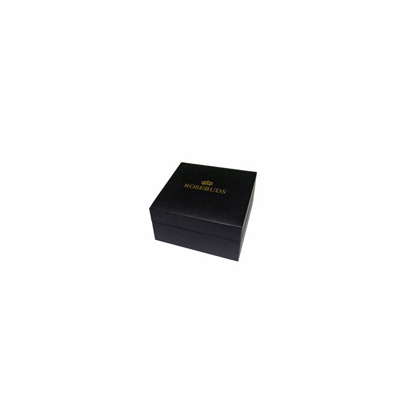Scatola nera rettangolare con la scritta Rosbebud, fodera in tessuto nero e un piccolo elastico per tenere il bocciolo in posizione.