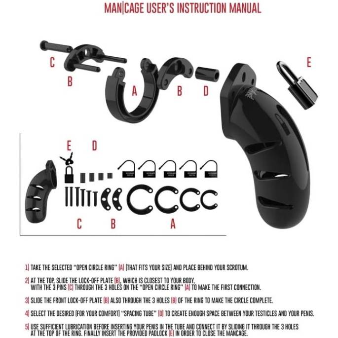 La cage se compose de trois parties qui s'adaptent parfaitement ensemble. Les deux broches de guidage relient les parties supérieures et la tige conique ovale relie les bagues à la cage. Une variété d'anneaux de différentes tailles (voir caractéristiques) vous permettront d'obtenir la taille parfaite pour votre morphologie!
