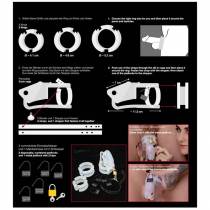 L'ensemble complet comprend 15 pièces au total: 1 ceinture de chasteté, 3 anneaux, 2 boucles avec trous, 1 bouchon, 1 serrure en métal avec 2 clés, 5 serrures en plastique numérotées. Longueur totale 11,3 cm, longueur de la manche du pénis 7 cm, Ø manche du pénis 3,5 cm, Ø anneaux 4,1 cm, 4,8 cm, 5,2 cm.