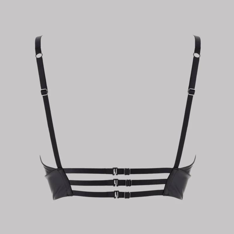 La brassière de la collection Chambre Noire de Maison Close est une pièce opaque qui redessine le décolleté tout en offrant un authentique maintien grâce à ses demies-armatures sur les côtés. Se ferme par trois élastiques en agrafes dans le dos.