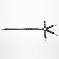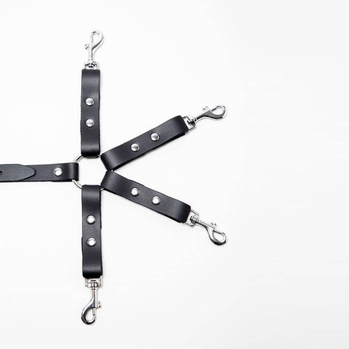 Ciascuna cinghia è dotata di un moschettone all'estremità, che consente di ottenere una cinghia di ritenuta robusta e flessibile, ideale per fissare insieme manette, cavigliere o qualsiasi altro oggetto. Potrete quindi scegliere la posizione in cui il vostro partner sarà meglio... "trattenuto"!