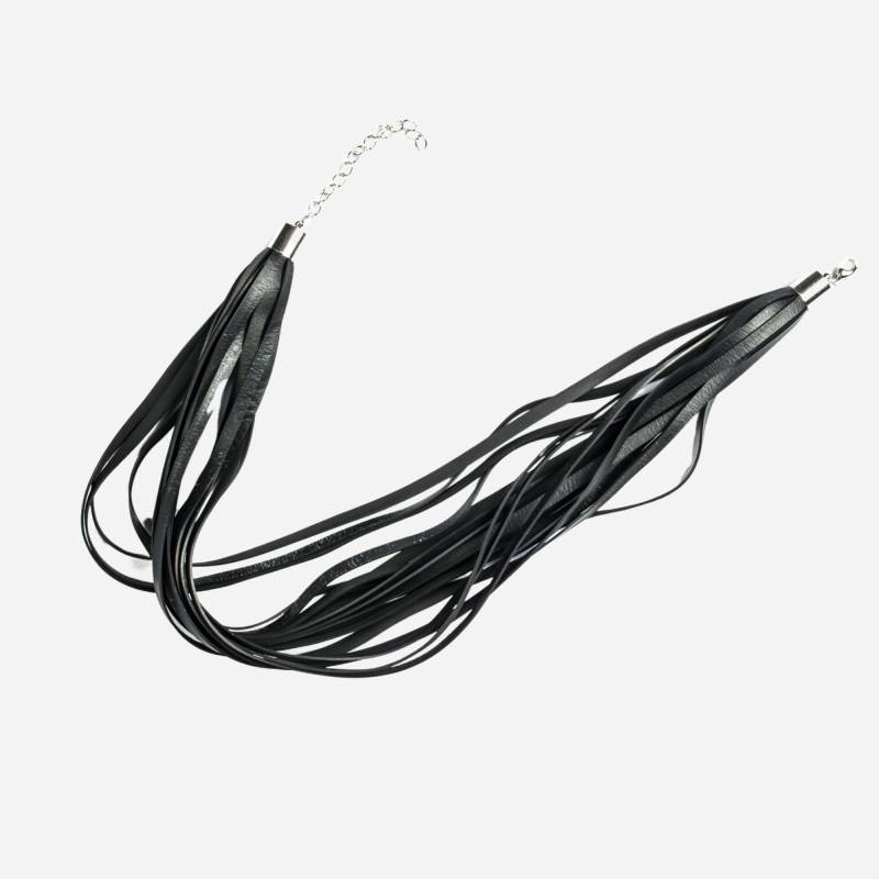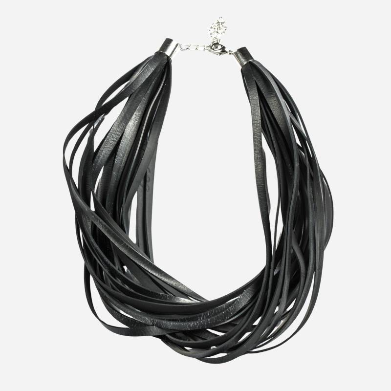 Aggiungete un tocco audace al vostro stile con questa collana con frange in caucciù riciclato di Fessée Artisanale.