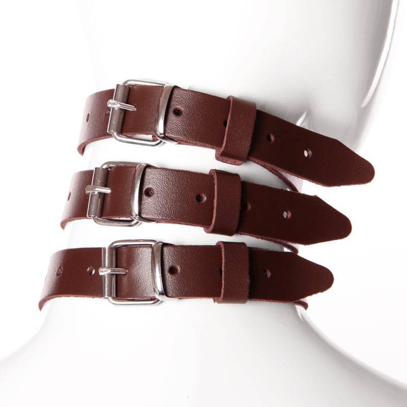Collier tout en cuir marron de qualité, constitué de 3 bandes de cuirs dotées chacune d'une boucle réglable avec trous (7 positions différentes) pour un ajustement parfait.