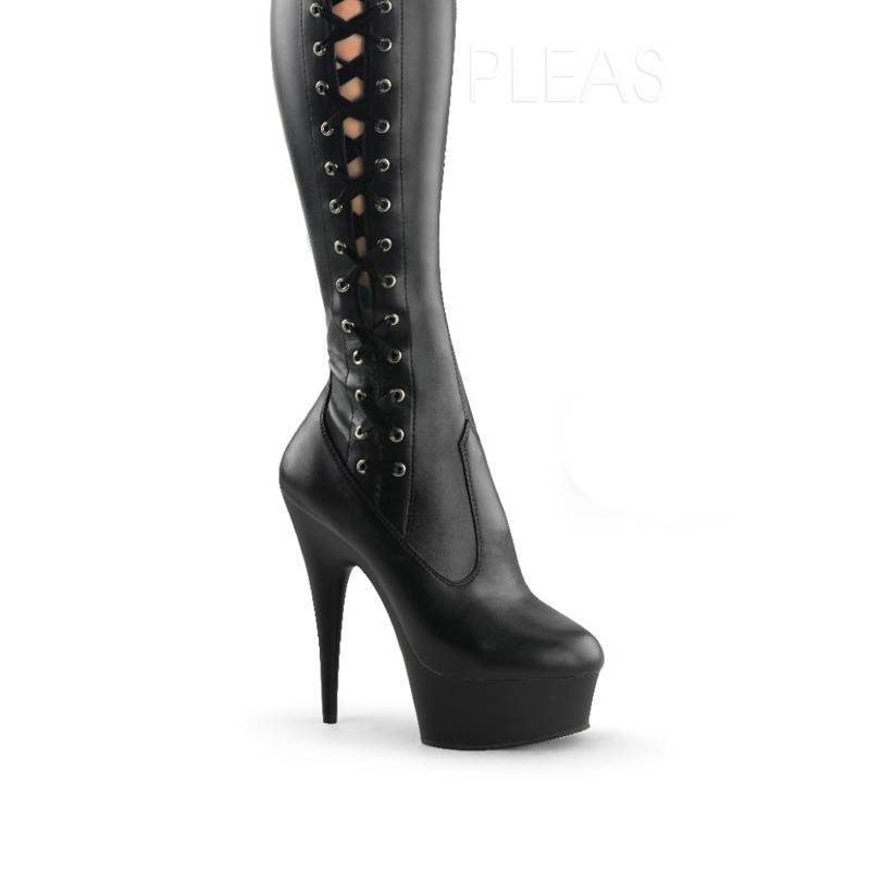 Cuissardes en simili cuir avec plateformes de 4 à 5 cm et talons de 15 cm, laçage sur le coté dans des oeillets métalliques et zip sur l'intérieur de la jambe pour plus de praticité.