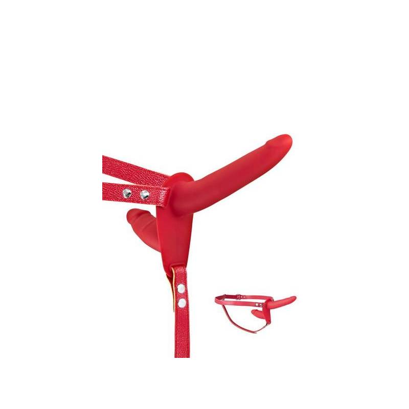 doppio dildo rosso da cintura composto da un dildo interno e uno esterno, con una penetrazione vantaggiosa per entrambi i partner.