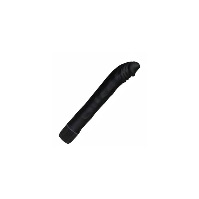 Dildo vibrante nero con superficie dura e liscia. Dildo leggermente venato e curvo a forma di pene.