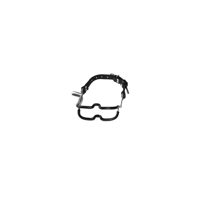 Divaricatore per bocca in metallo rivestito in lattice con cinturino in pelle leggermente screpolato e fibbia per una tenuta ottimale.