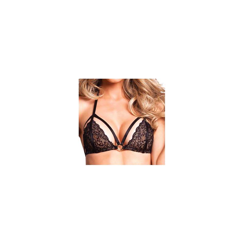 Soutien gorge à lanière avec sur l'avant un petit anneau décoratif. Attache dans le dos et à la base du cou.