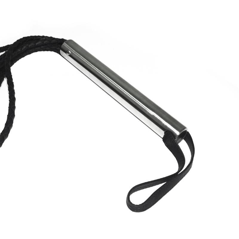 Les lanières sont réalisées en cuir tressé tandis que le manche, large, est en métal. A son extrémité, une dragonne!