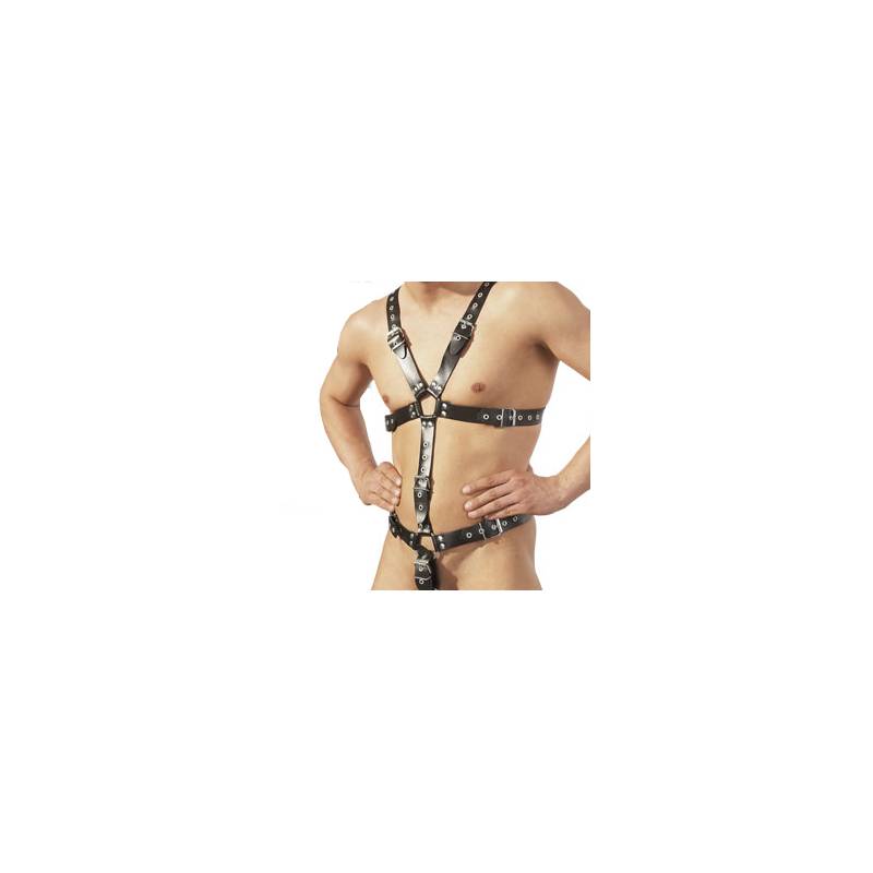Ce harnais est composé de plusieurs sangles, reliées entres elles par des anneaux, elle sont toutes équipées de boucles afin d'ajuster au mieux le harnais.