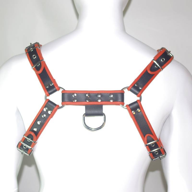 Superbe harnais en cuir épais noir riveté avec bordures rouges.