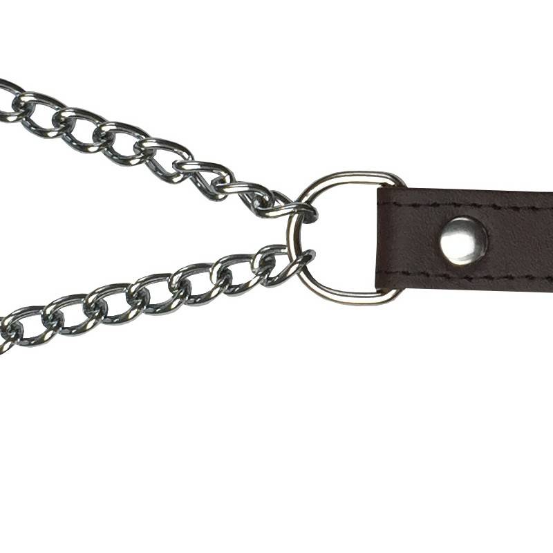 Cette laisse en cuir marron épais et lisse est rivetée sur un anneau en métal duquel partent 2 chaines également en métal. A l' extrémité de chacune de ses deux chaines, une pince à seins au réglage très précis dotée d'embouts en caoutchouc noir pour plus de "confort".