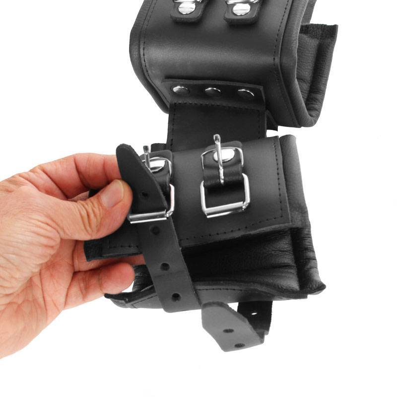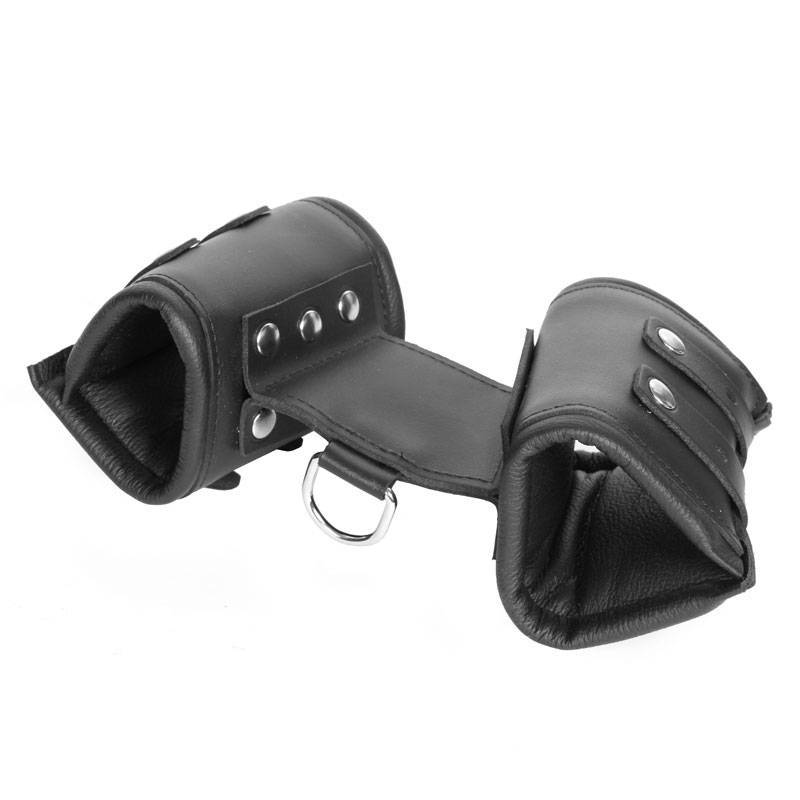 Manette molto grandi in pelle nera abbinate a un pezzo di pelle rivettata con anello pendente