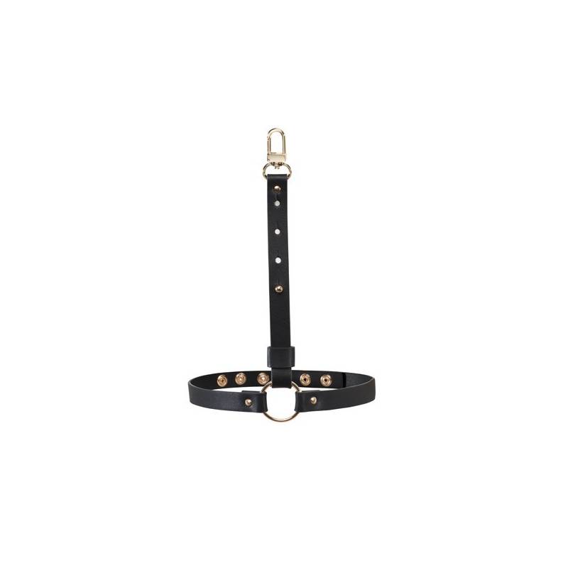S'accroche tout simplement au pantalon via un mousqueton discret. Entoure ensuite la cuisse à la façon d'une jarretière classique. Anneau métal doré sur l'avant.