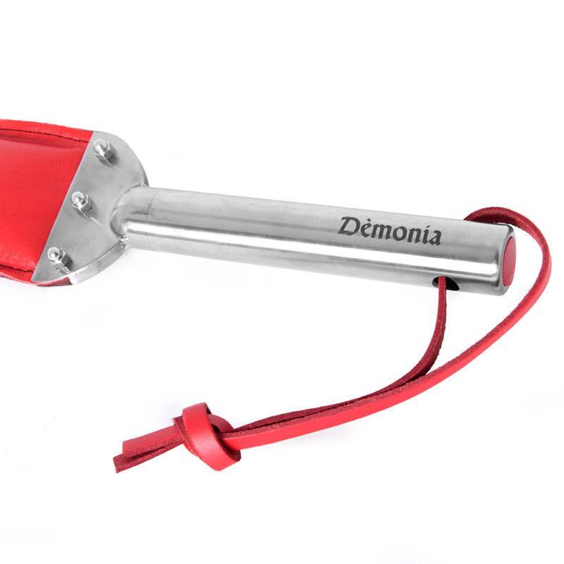 Petit paddle molletonné en cuir rouge avec manche en acier inoxydable estampillé "Dèmonia"