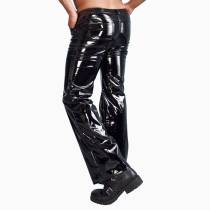 Pantalon long en vinyle noir, coupe droite au niveau des jambes. il est doté d'un zip classique invisible.