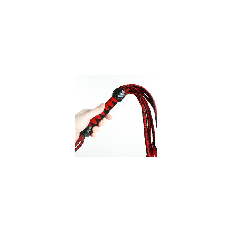 Ce très joli Cat O Nine est un martinet en daim noir et rouge composé de neuf lanières en daim tressé. Le manche, également en daim est d'une longueur de 18cm et se termine par une dragonne.