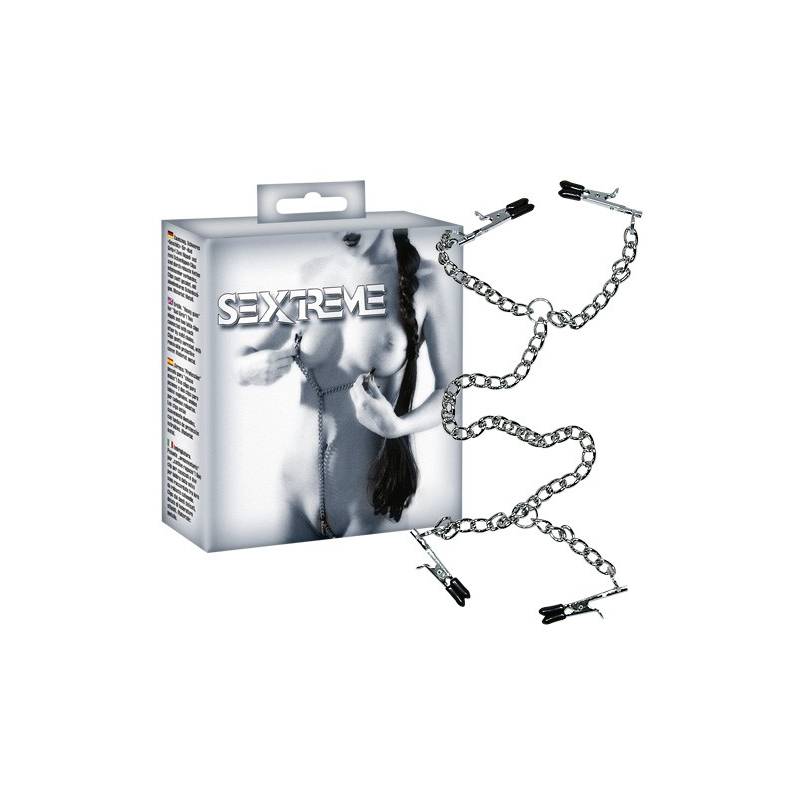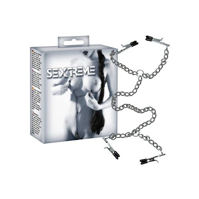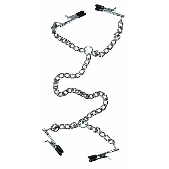 2 coppie di clip (1 per il seno, 1 per il sesso), con protezioni in plastica nera, sono collegate tra loro da una lunga catena con un anello a ciascuna estremità.