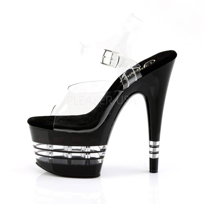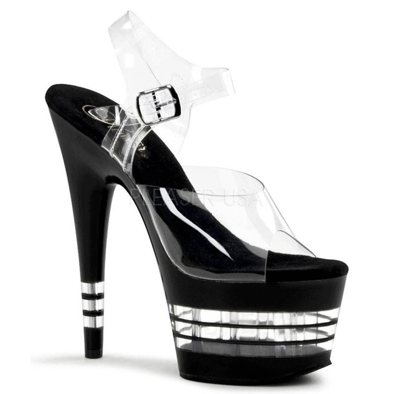Sandales à lanières en plastique transparent et dont la plateforme et le talon sont en verni noir avec 3 bandes plexi transparent.