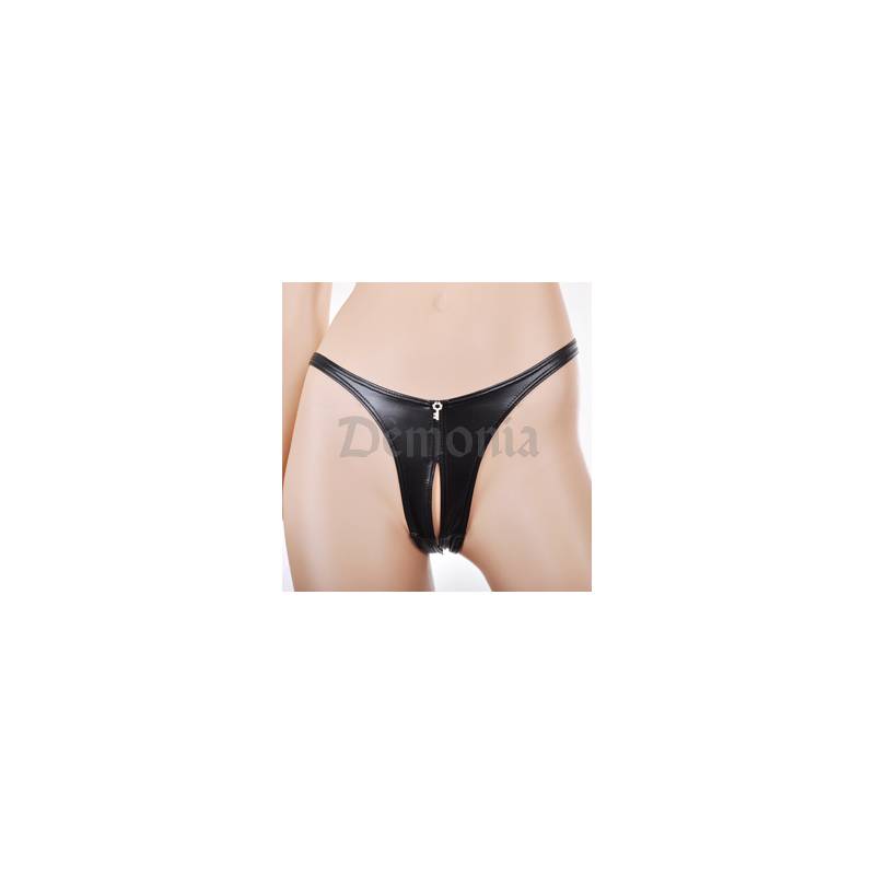 String en lycra laqué satiné noir avec une petite clef, cousue surle haut,en métal avec des strass.